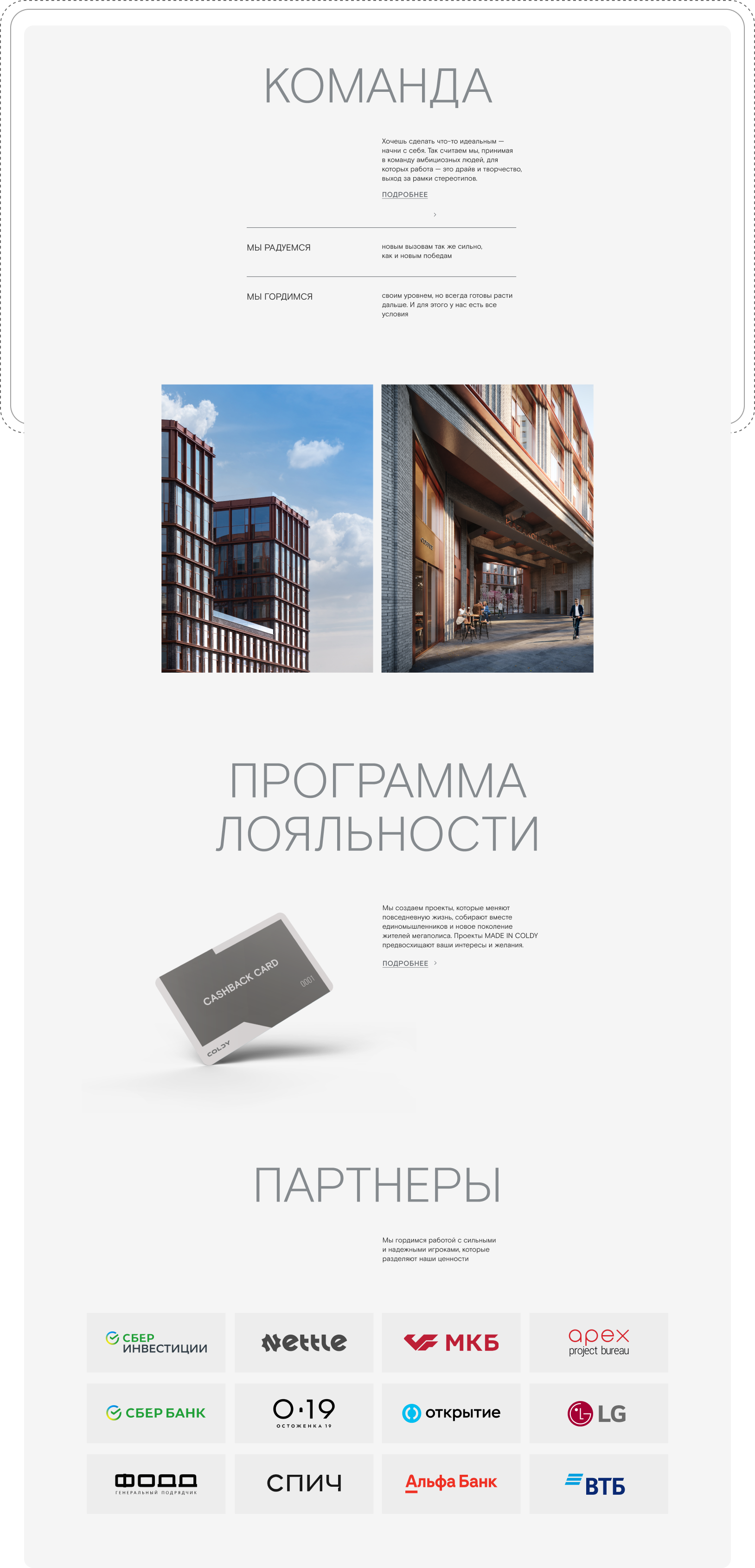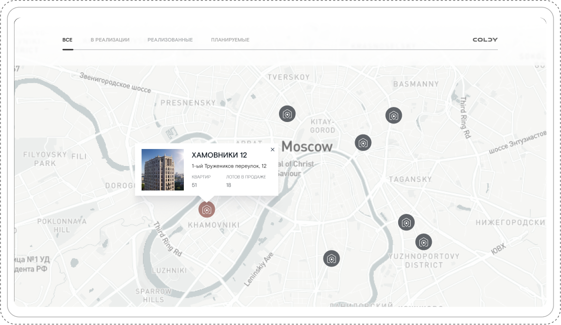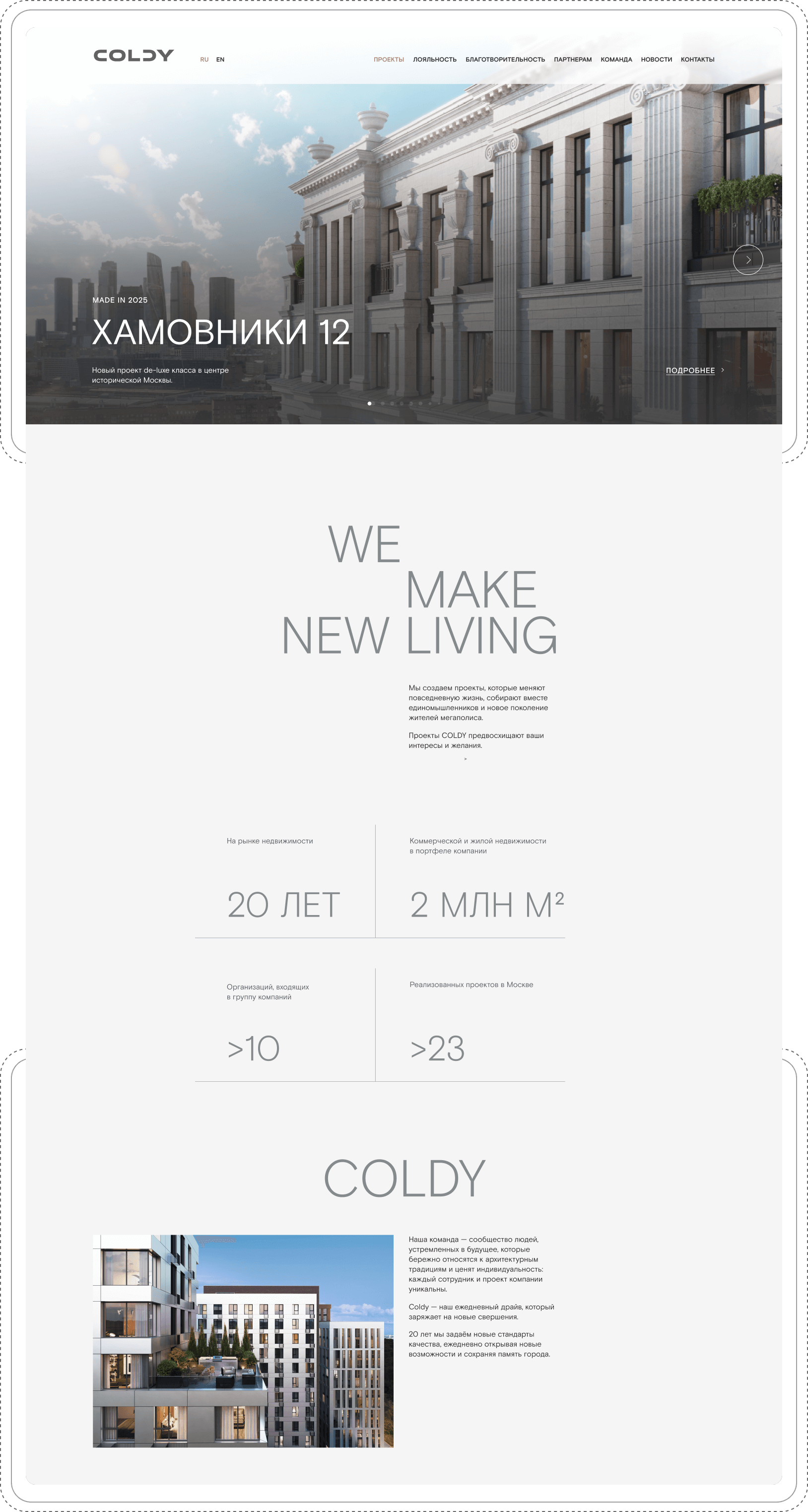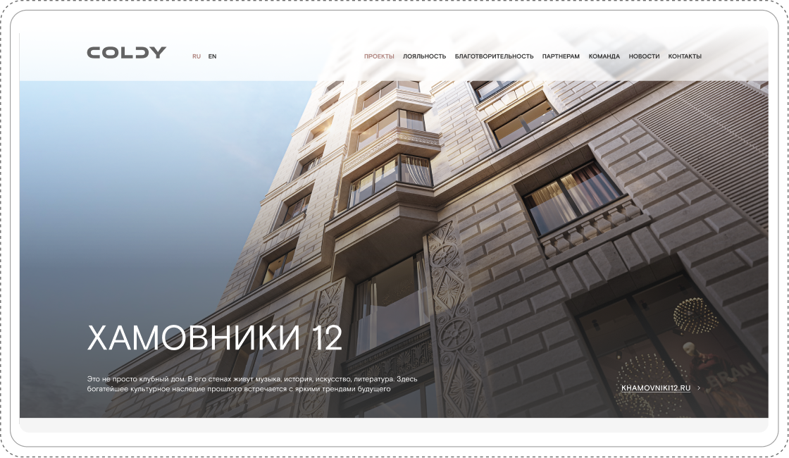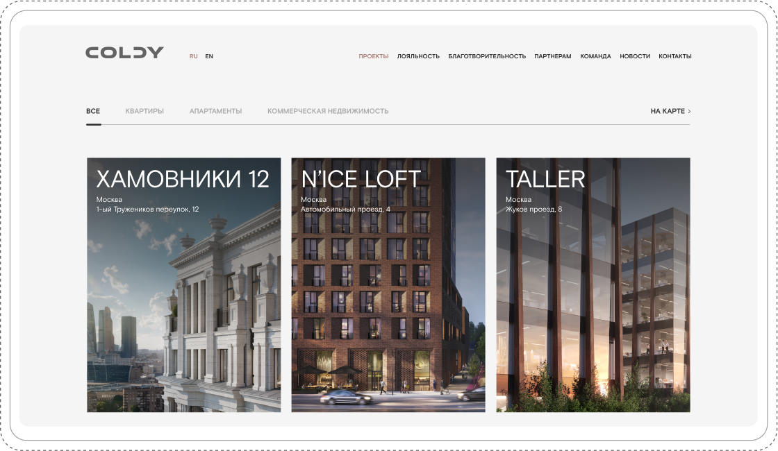 Бутиковый девелопер COLDY долгие годы выступает трендсеттером пользовательского комфорта и инноваций. Работа с ним стала для нас новым профессиональным вызовом. Перед BrandTec стояла задача по доработке сайта девелопера до интуитивно понятного дизайна главной страницы. Обновления были призваны создать прямую корреляцию между подходом компании в бизнесе и её образом в сети